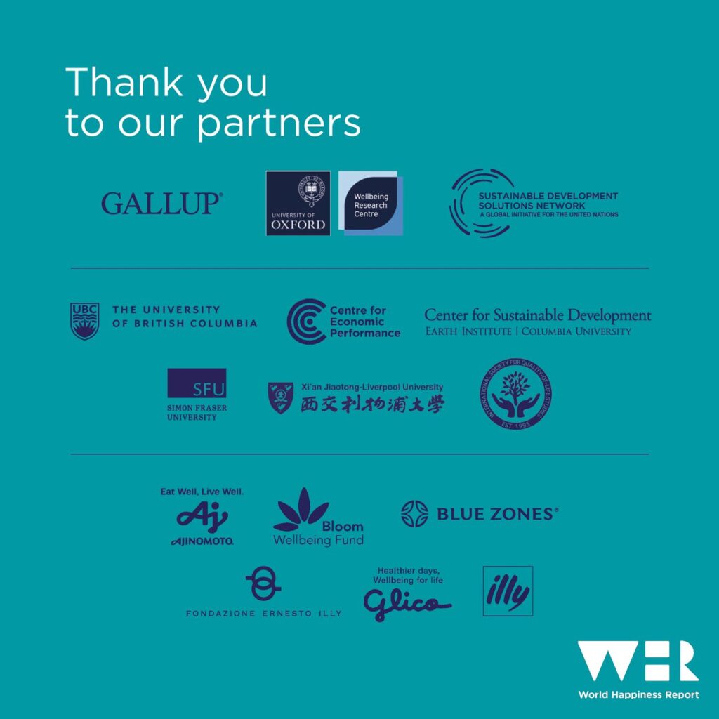 World Happiness Report を支える多くのパートナーの名前が並んでいました。